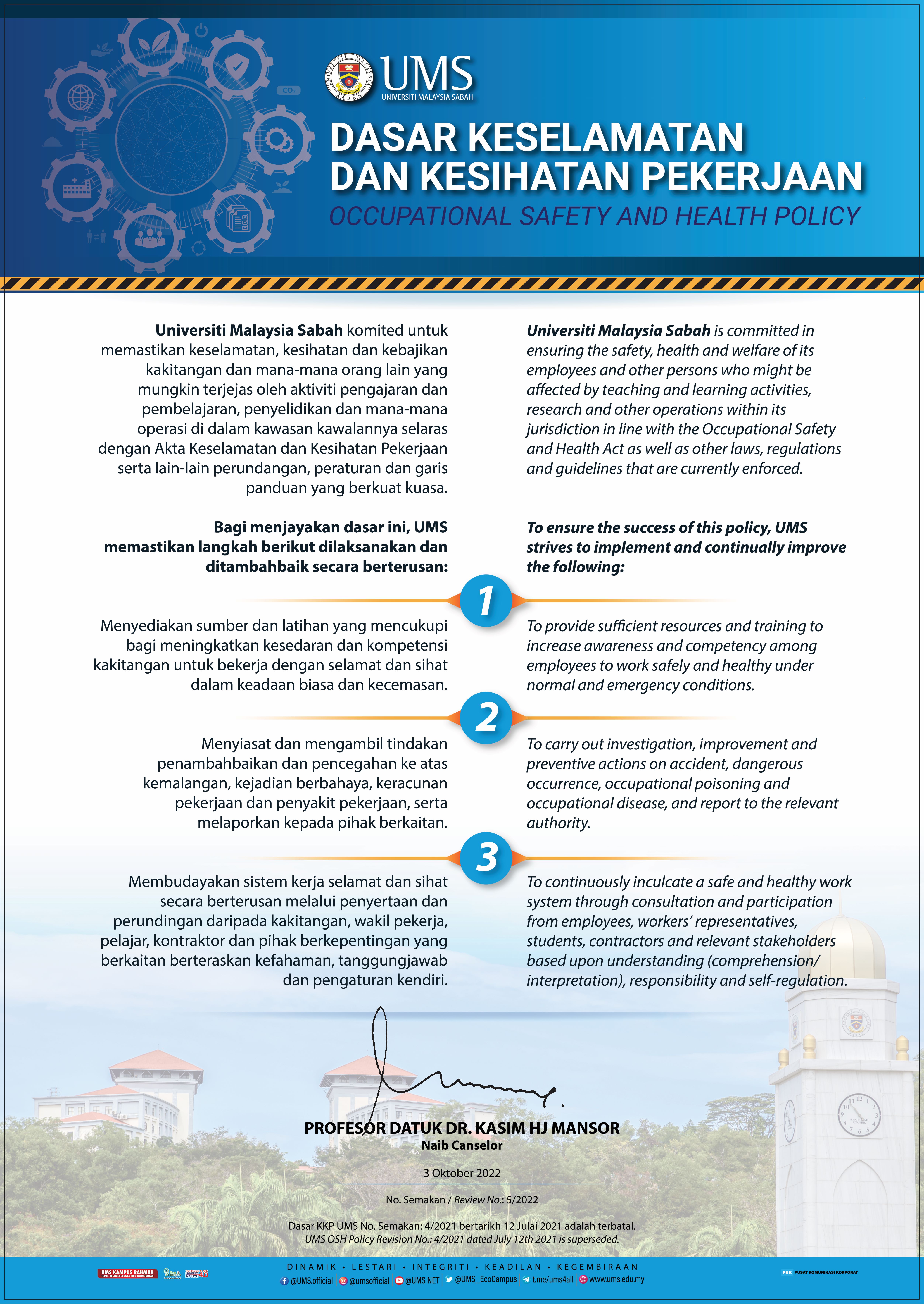 Universiti Malaysia Sabah is committed in ensuring the safety, health and welfare of its employees and other persons who might be affected by teaching and learning activities, research and other operations within its jurisdiction in line with the Occupational Safety and Health Act as well as other laws, regulations and guidelines that are currently enforced. To ensure the success of this policy, UMS strives to implement and continually improve the following: